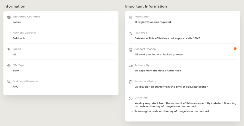 Additional information for each eSIM in various countries, with popups that can also be customized with product data. We use metaobjects that are linked to the metafields of each product.