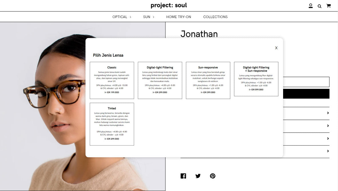 Tim kami mengembangkan fungsionalitas yang memungkinkan pelanggan akhir untuk memilih & mengonfigurasi lensa mereka menggunakan parameter jenis dan warna bingkai.